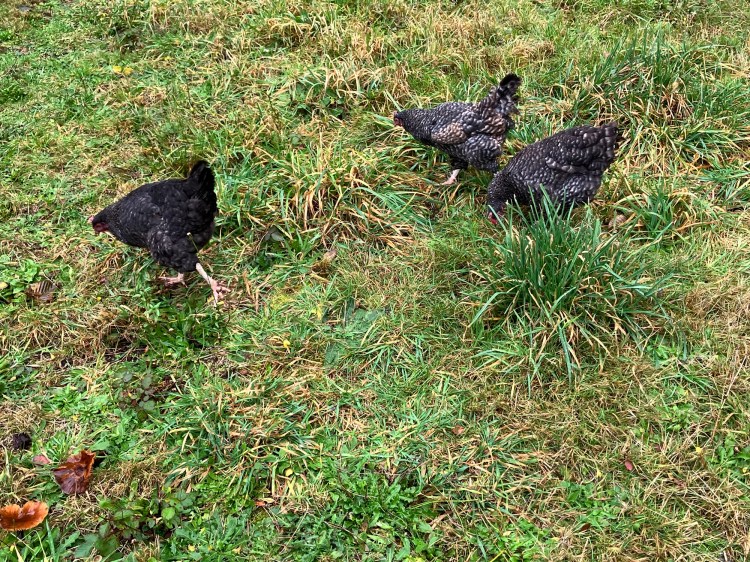 Here are the girls out for some foraging despite the rain. It’s a good time for them to find nightcrawlers that come to the surface when it’s wet. They actually eat very little in the way of feed as they get table scrapes from two households and forage during the day most days.