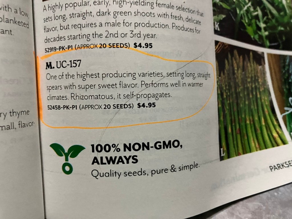 So why am I bringing this up? Because the new asparagus seeds, which are an F2 hybrid, will raise eyebrows in those folks who are clearly confused. Asparagus UC-157 F2 hybrid is not a gmo. It was conventionally bred. It likely took MANY years to do so. With meticulous notes, thinning out the unworthy, and encouraging the best traits. An F1 hybrid would take several years in itself to grow and assess. Then to breed that F1 hybrid with itself to become an F2 hybrid and again, with many years of assessing and seeing if the good results can be repeated enough times to make seeds the will become plants that have the traits desired. In this case, an asparagus that can clone itself with rhizomes rather than procreating just by seed.