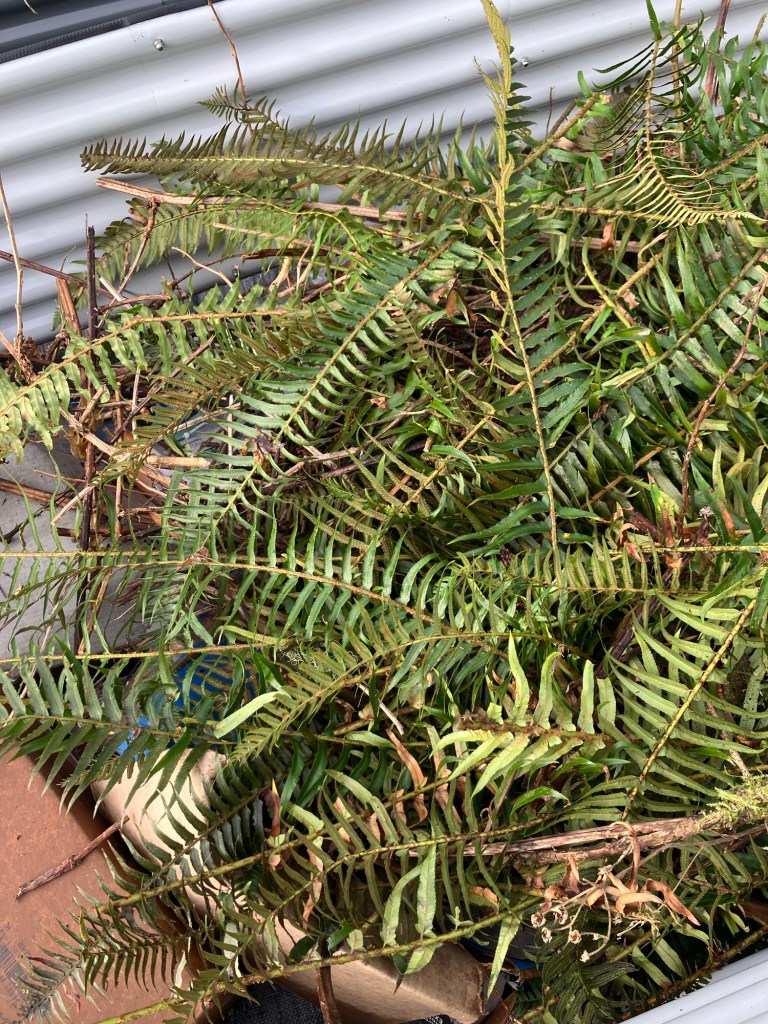 It’s terribly nice weather so after loading the rig with trash to take to the dump tomorrow and helping with the delivery of the new homestead washing machine, I did laundry, and then decided to work outside a bit more in the woods clearing space around that wild apple tree and using the ferns and dead blackberry vines for filling more raised beds. I needed to anyway, staying busy helps with the PTSD anxiety when it gets really bad like it was yesterday.
