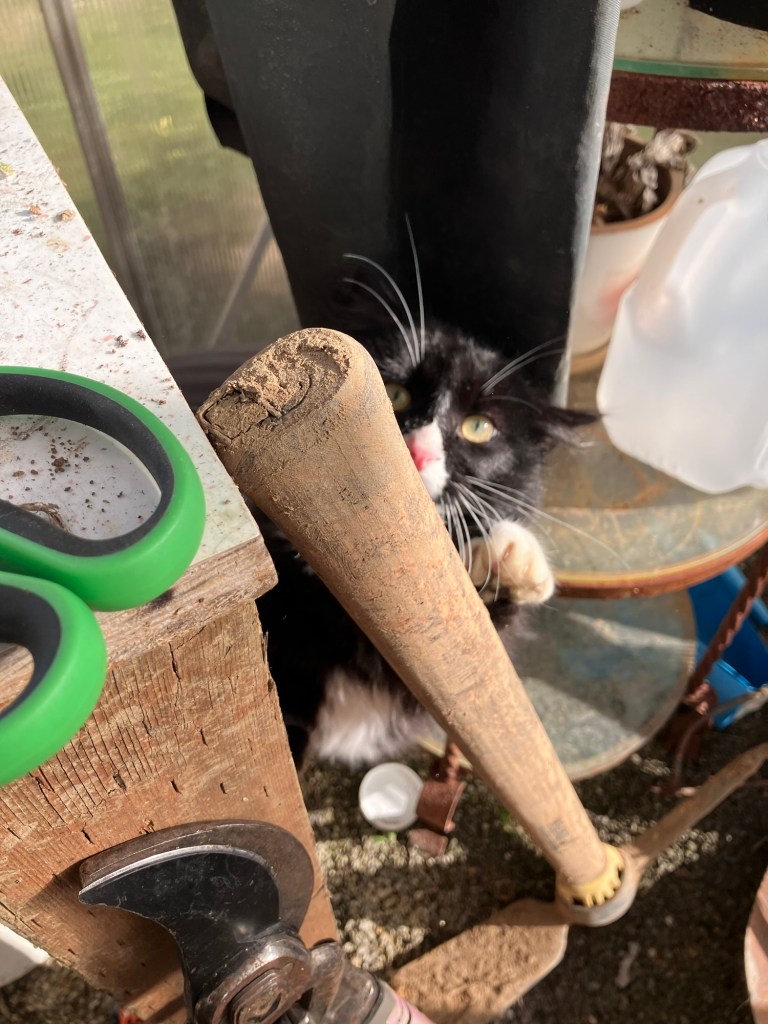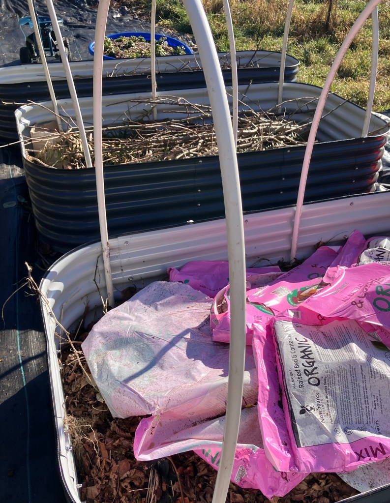As I was puttering around I recalled there were some pvc pipes laying around. Have been for a very long time. That gave me an idea and I brought them into the garden to see if they could work with the raised beds. Yes! I can get some frost protection/ bug protection cloth to get plants started with protection. I’ll cut the longer pieces to act as stays/stabilizers to keep the “hoops” in place. I probably need a hacksaw or something like that to cut them.