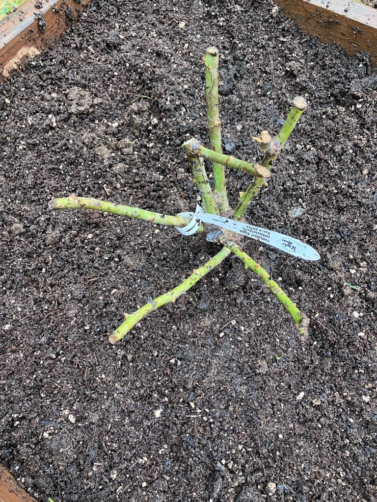 Once I got it planted, I added a few seeds for flowers on the bare soil. The rose is called “Twilight Zone.” And it’s a splurge, I know, BUT life without roses isn’t very fun at all and I can use the flowers in tea and crafts.