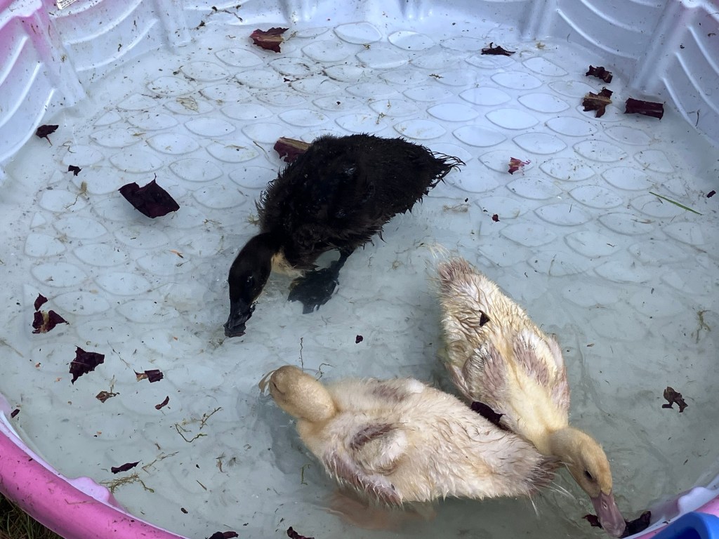 The ducklings had a fun time this morning playing in a little pool. I have them lettuce and peas from the garden to eat and play with.