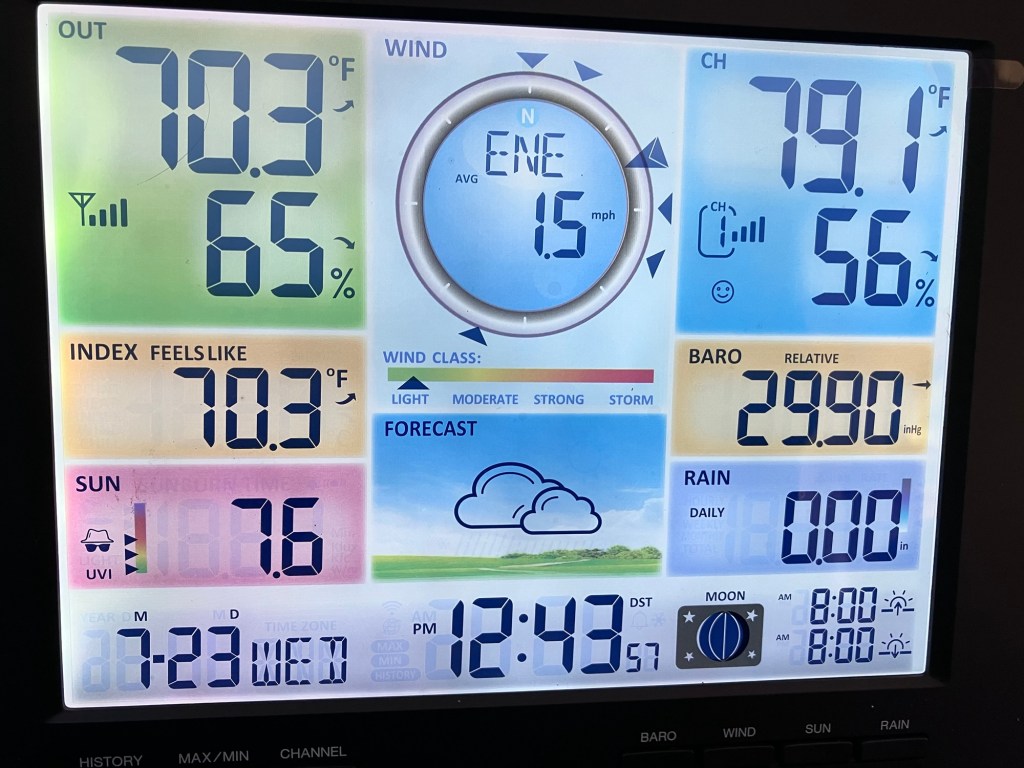 I got my personal weather station up and running today as the mounting pole finally arrived. Now I don’t have to rely on questionable apps for my weather data.
