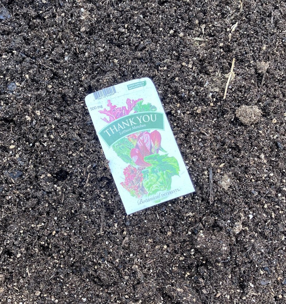 I then added a little bit of fresh soil, and hand raked the bed removing any of the few roots that had taken root (I’m learning to enjoy the practically weed free raised bed gardening!) and put down some seeds.