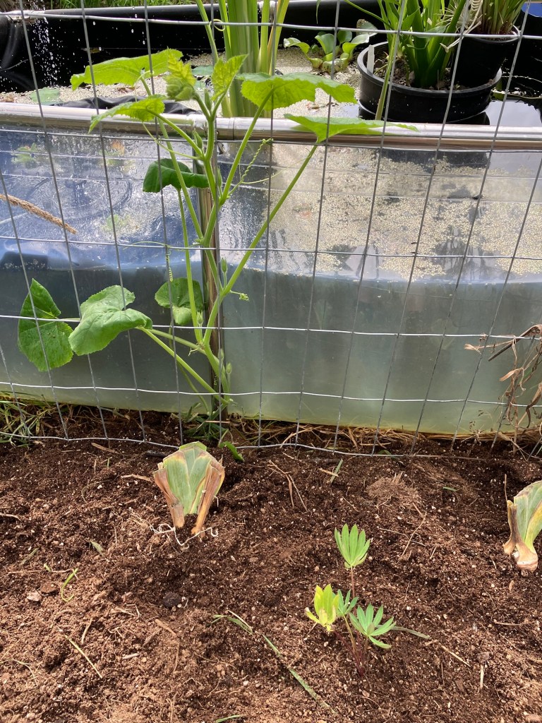 I had a little energy today so decided to dig up a bit of ground before we are hit with an atmospheric river that’s on the way. Dug up, grass roots removed, soil amended and Iris roots that arrived yesterday planted. Added a wild lupine seedling because I still have a few trays of them so I plop them in wherever, and low growing flower seeds sprinkled, Sweet alyssum and viola.