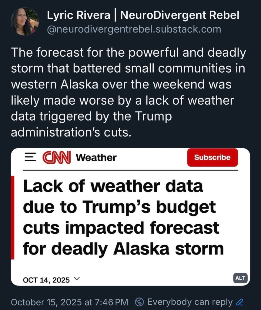 Alaska tragedy- made worse by lack of warning due to trump cuts. Posted byOliviaOctober 15, 2025Posted inclimate changeTags:climate, climate change, environment, news, politics, science, storm, weather Because we all knew that would happen. Share this: Click to share on X (Opens in new window) X Click to share on Facebook (Opens in new window) Facebook Like Loading... Related Published by Olivia I live in a magical place, trying to live my best life. View more posts