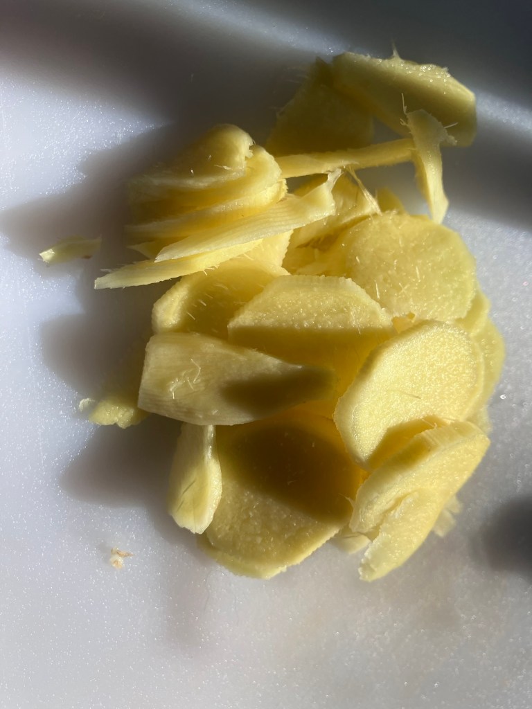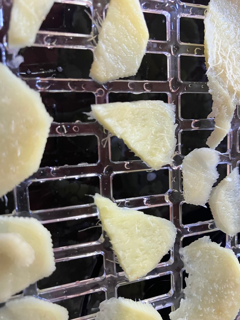 I also had some extra fresh ginger root left over from jam making and dried slices of that. The ginger only took a couple hours… a lot less time than juicy tomatoes. Nothing going to waste!