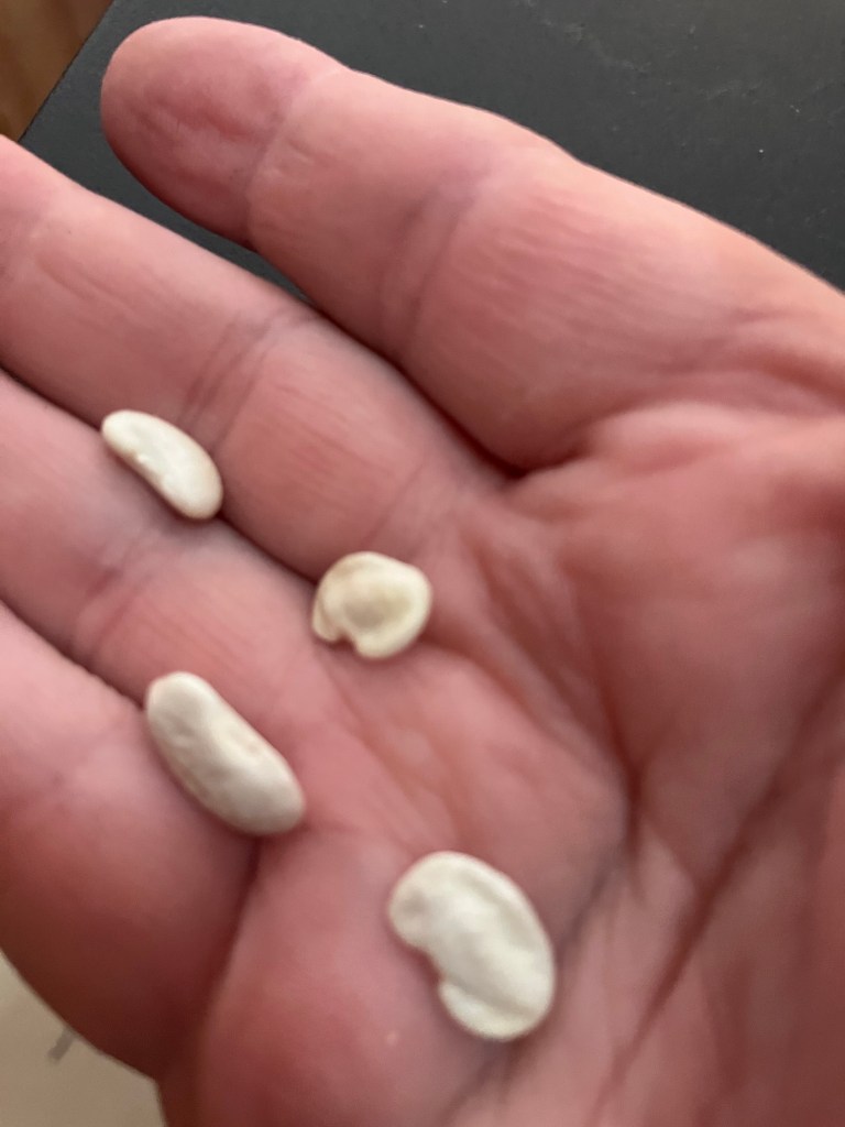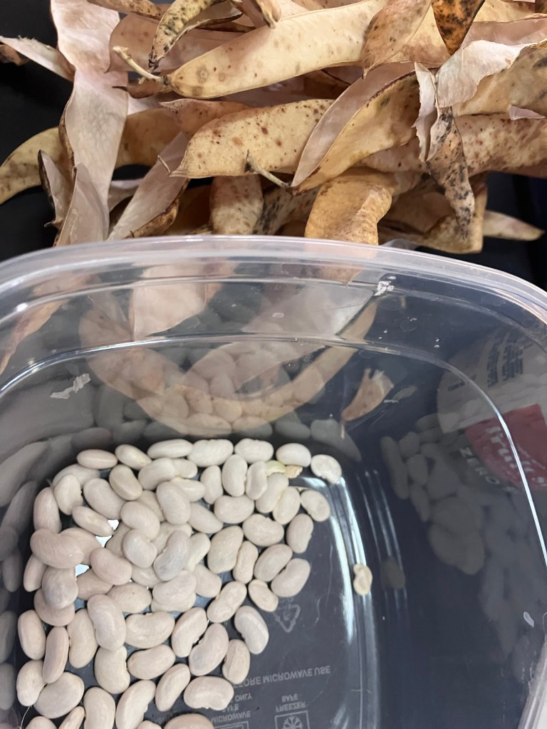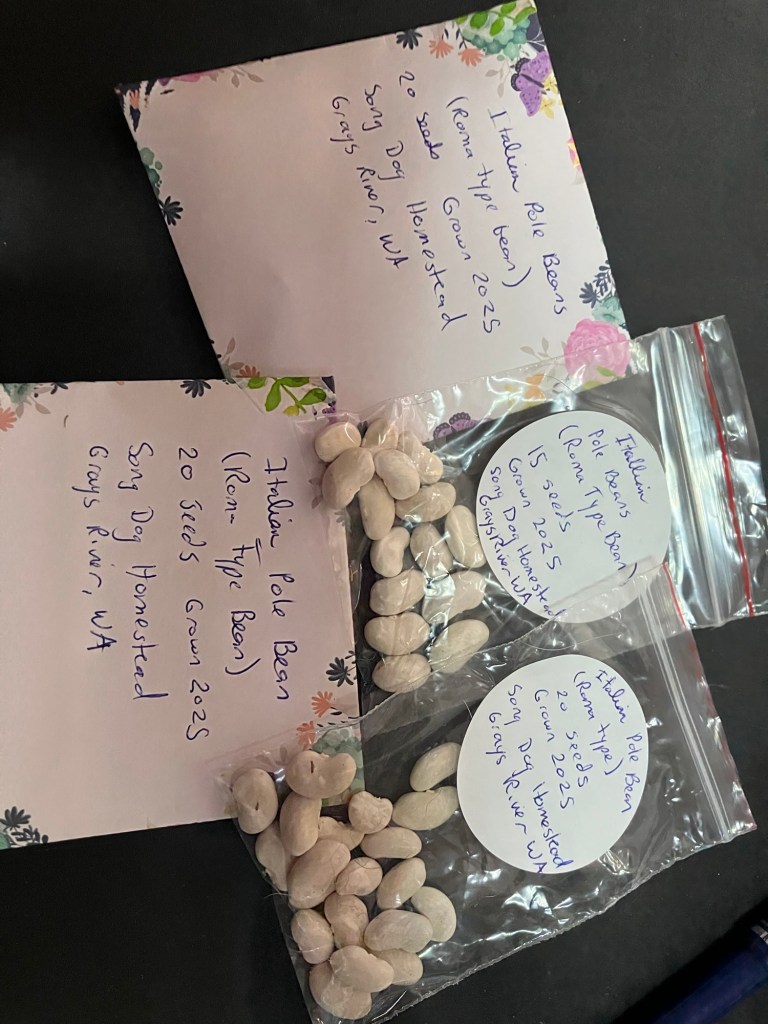 My saved bean seeds were dry and ready to shell and packaged up for sharing. I absolutely love these Roma type Italian pole beans. So succulent and delicious even at a very large size. Honestly they are so productive I only need a few vines for myself! I remove the imperfect beans before packaging. They are useless and you really only want to save good ones to keep a strain healthy. A lot of seed saving/ keeping is ruthless culling of weaker seeds and plants. my saved seeds will go to people who want to trade or to the free seed library in town.
